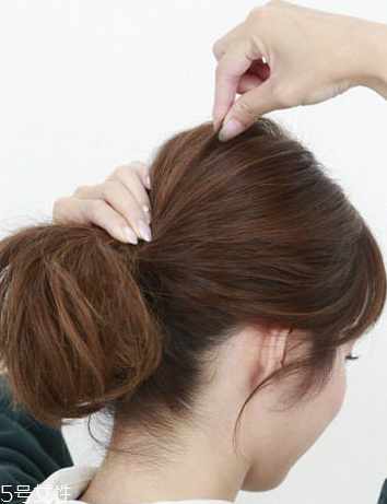 将穿发棒垂直穿过橡皮筋固定处的中间,再将发束穿入圆环部位后向下拉,将发髻的部分朝左右拉开以适度的抓松,最后,压住固定部位抓松头顶和侧边的头发可变得立体!